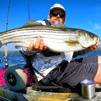 It has been a busy and eventful season so far, with many successful striped bass trips with clients new and old from early May through this week. There have been countless solo sessions in between guided trips to pattern these fish the best I can. Most of my striper trips have been in the Connecticut River, mainly because the fishing has been so consistent, and consistency is just as important if not more important than size. The average size fish is also pretty good, right around 32", which is a fun size on light gear and having a kayak as your fishing platform. There are plenty of bigger fish in the mix too, but the majority have been slot sized to just over slot. Staying away from the fleets has been the biggest issue, along with wind on some days, but clients who have been able to get out with me during the middle of the week have experienced some excellent fishing with far fewer boats running the bass over. Weekends can be tough on pressured water, but there are little niche bites you can get into with certain tide/location setups in areas most boats won't venture into or other anglers might not know about. These river fish can turn on and off at the flip of a switch, and some days live bunker are your only hope at catching. Other days, big topwater plugs or soft plastics are getting blasted nearly every cast. This year's spring run has been great in comparison to the past several years, and I feel like I have a head of steam going into July. In the coming weeks, my striped bass focus will shift to structure areas of Long Island Sound at night and pre-dawn using live eels, large soft plastics, and plugs. I'm kicking myself I haven't spent more time on the sound this year, but the river bite has been great.